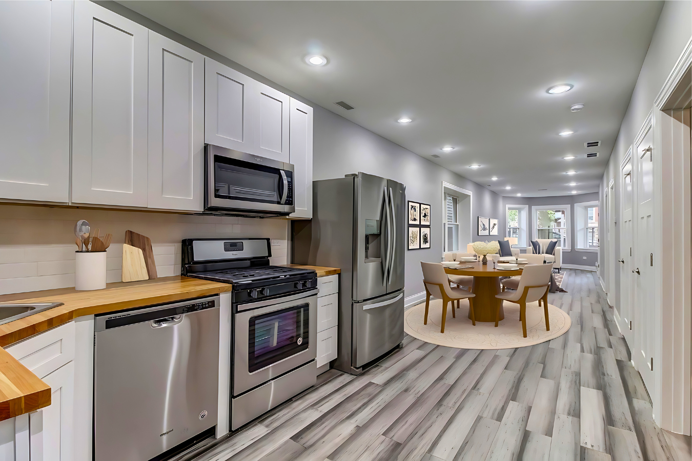 During the Hermosa condo remodel, we faced several challenges, including the complexities of adding a fourth-floor duplex to an existing structure while maintaining the building’s structural integrity. Reconfiguring the interior layout for an open-concept design required meticulous planning to maximize functionality without compromising the flow of the units. Additionally, upgrading outdated electrical, plumbing, and HVAC systems presented logistical hurdles, especially in a multi-unit property. Finally, Chicago’s strict building codes and inspections demanded precise execution at every phase, ensuring the project met safety and quality standards while staying on schedule. Despite these challenges, we delivered a seamless transformation.